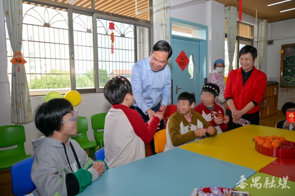 在番禺区社会福利院,黄彪与正在活动室参加假期活动的孩子们亲切互动,给大家派发红包,分发寓意“马到成功”的马拉糕,场内张灯结彩,喜气洋洋。黄彪叮嘱院方进一步提升服务质量,用心用情呵护每一位孩子的成长,让他们在安全、温暖、欢乐的氛围中度过新春佳节,同时继续守正创新,深化番禺“慈善之区”建设。
